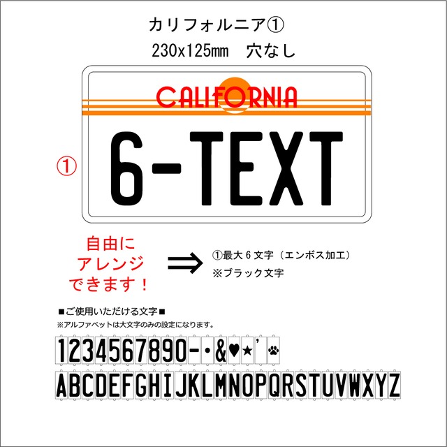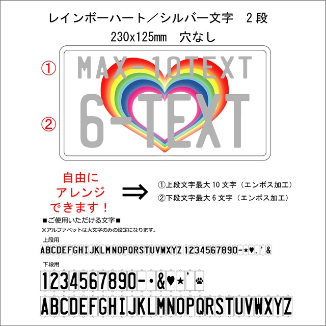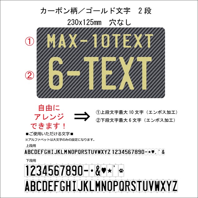 オリジナルのデザインや画像+エンボス加工で世界に1枚だけのプレートを作製いたします。 注:この商品はデザインデータまたは画像データのご入稿が必要になります。 サイズ:230x125mm 材質:アルミ(厚さ約2mm) 文字は型押しになります。 2段の場合:上段最大10文字、下段最大6文字 3段の場合:上段最大10文字、中段最大10文字、下段最大10文字 文字色:白・黒・ゴールド・シルバーの中からお選びください。 ご注文の流れ:ご注文時に文字色をお選びください。 ご注文確定後、ご登録のお客様メールアドレスにデザインの入稿方法などを当店担当者よりご連絡いたします。(ご注文確定の自動配信メールとは異なります)メールでの打ち合わせになりますので画像などご確認いただけるメールアドレスをご登録ください。入稿デザインをお持ちでない場合はイメージをお伝えいただければお手伝いさせていただきます。仕上りイメージをお客様にご確認いただき、OKをいただきましたら作製・発送になります。