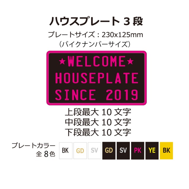 サイズ:230x125mm 材質:アルミ(厚さ約2mm) 文字は型押しになります。上段・中段・下段とも最大10文字まで。 プレートの種類を選択してください。 ご注文の流れ:プレートの種類、型押し文字内容、穴あけの有無をご指定いただきご注文お願いいたします。ご指定いただいた内容にて仕上りイメージ画像をメールでお送りいたします。イメージ画像をご確認いただきOKでしたら作製に入ります。修正や変更などがございましたら再度ご確認いただきます。お客様のOKをいただきましたら通常1~3営業日以内に発送いたします。