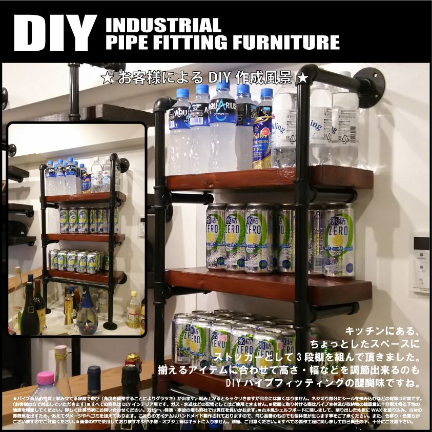 様々なパーツやパイプやウッドシェルフを組み合わせて棚やテーブルなどお好みのインテリアを希望のサイズで作成できます。屋外対応防錆塗装済み鋳鉄製(塗装済みではございますが、ネジ切り部分より全体に錆が発生しますので御了承ください)。重厚なパイプを組み上げることにより非現実的な空間が生み出されます!また全ての商品はDIYインテリア用ですのでガス・水道などの配管としての使用はやめてください。パーツには製品の性質上細かな擦れやヘコミがあります。パーツごとの販売になりますので組み立て工程はお客様になります。パーツに個体差がありネジ込みにくい物がありますが、別途パイプレンチ等をご使用されると組み易くなります。また最後まで締め込まずとも組み上げることは可能です。組み立ての際はくれぐれもご注意ください。