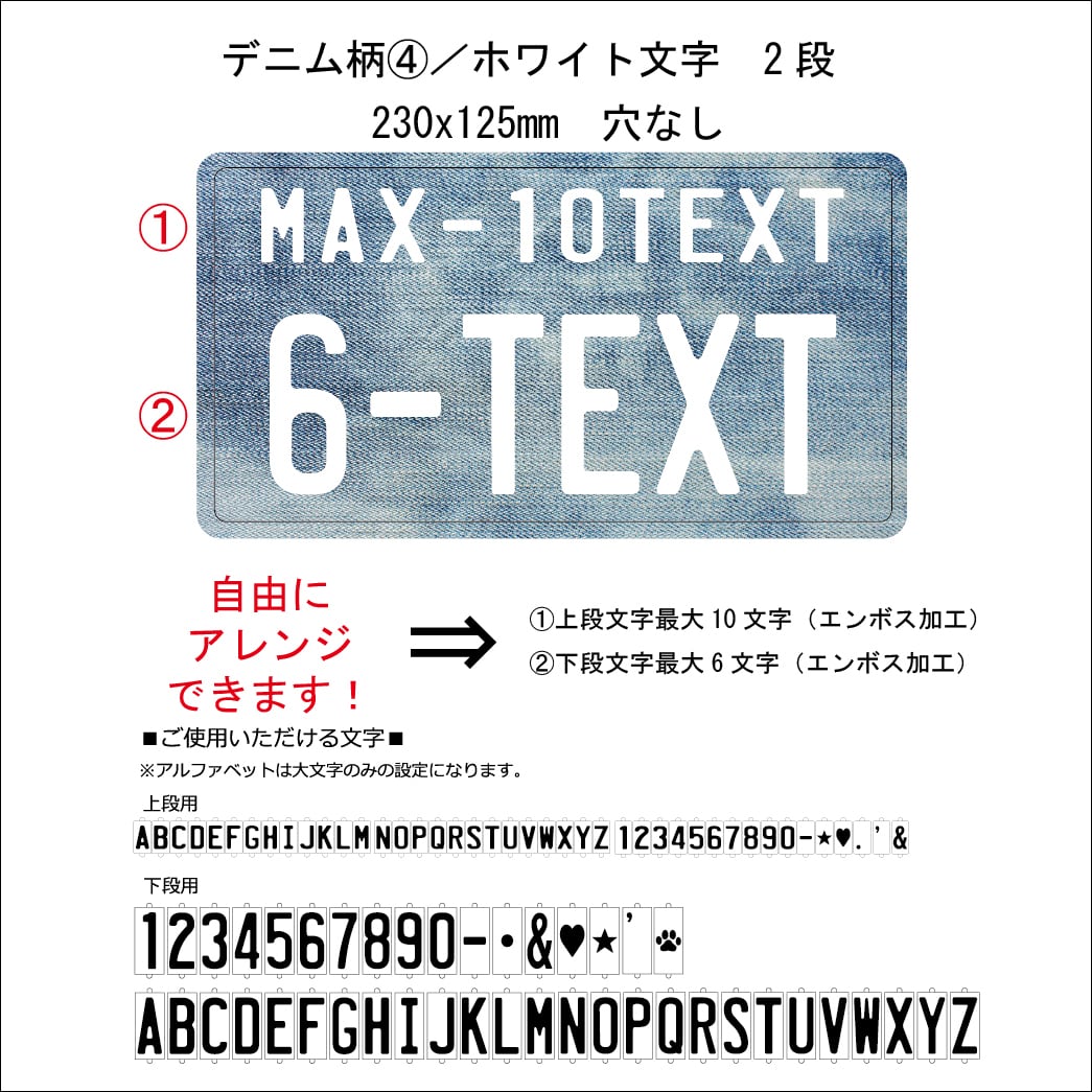 文字は型押しになります。上段最大10文字、下段最大6文字まで。